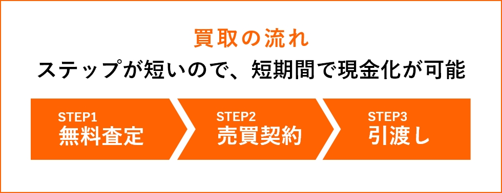 通常の売却では、当社の販売活動、売却の契約手続きなど、多くのステップを経て現金化する為、6ヶ月ほど要する場合がほとんどです。定められた期日までに現金化する必要があるといったご要望のお客様には、当社が直接購入させていただくことにより、ご希望の期日に合わせて現金化をすることが可能です。