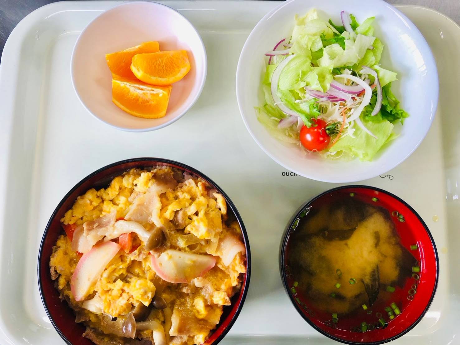 ・他人丼 ・グリーンサラダ ・フルーツ ・味噌汁
