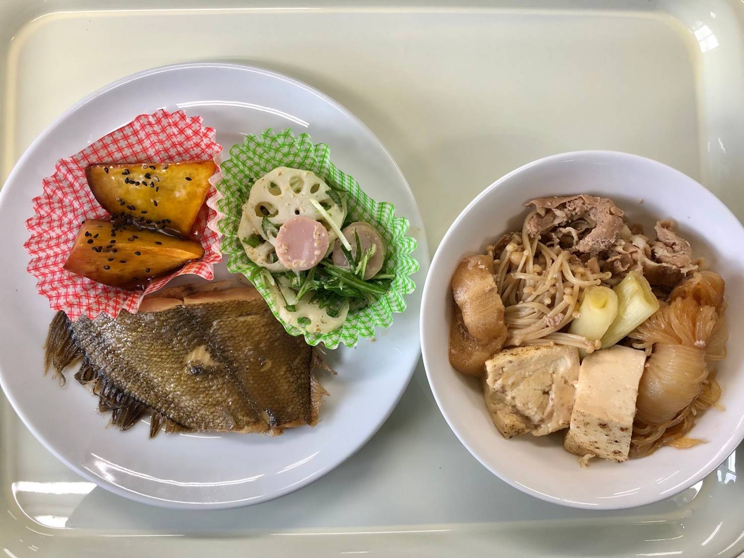 ・カレイの煮つけ ・水菜とれんこんのサラダ ・すきやき風煮こみ ・大学いも ・ご飯 ・味噌汁