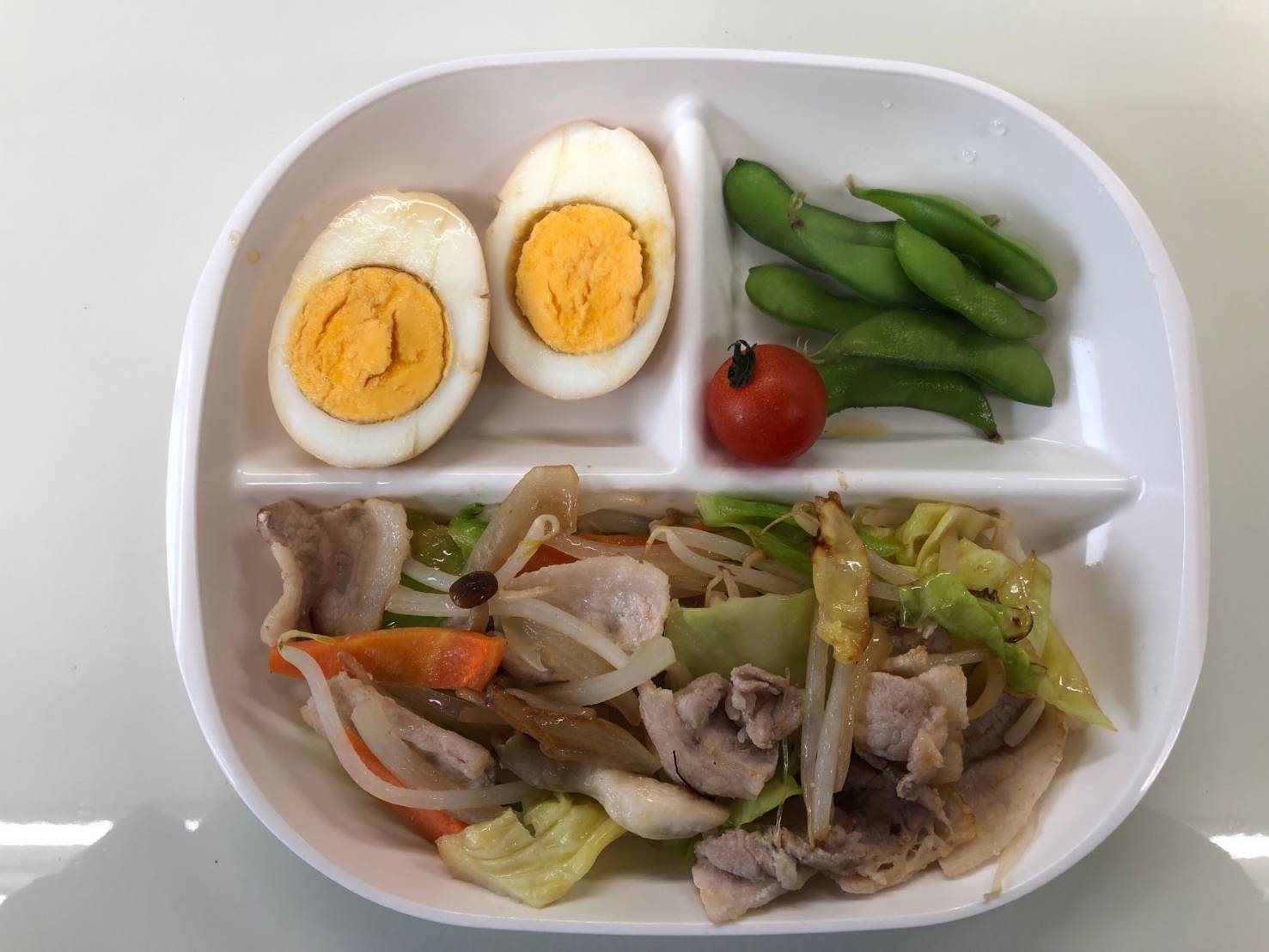 ・肉野菜炒め ・煮たまご ・えだまめ ・ご飯 ・味噌汁