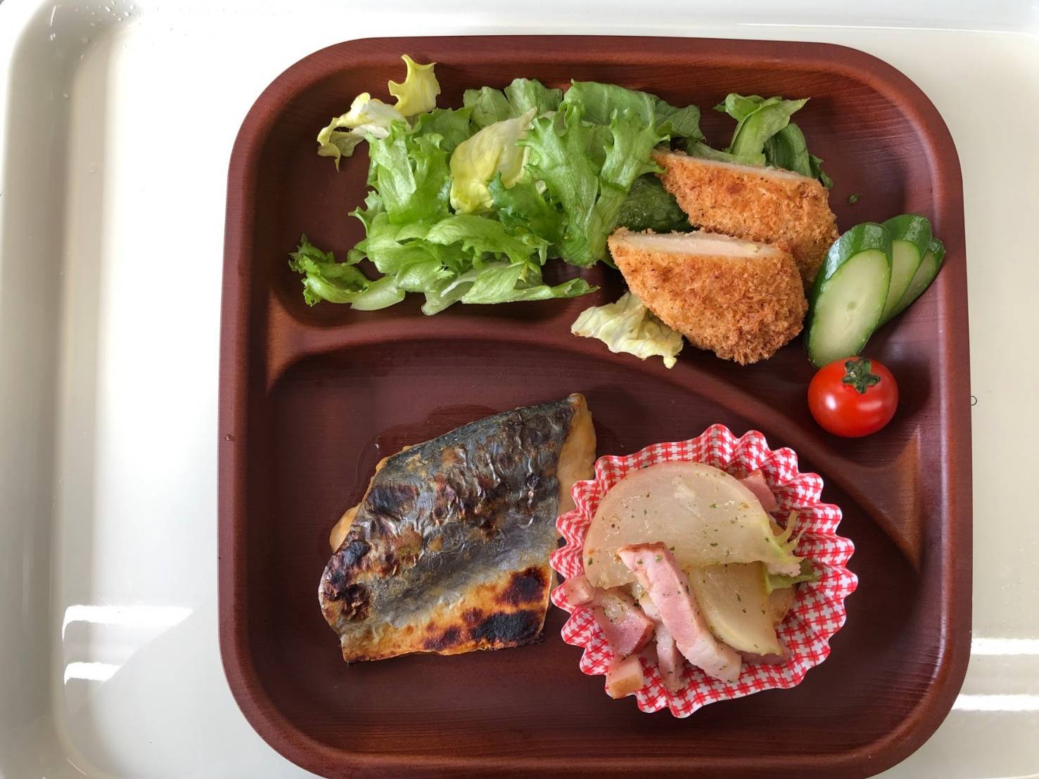 ・焼き魚 ・かぶとベーコンの塩炒め ・ササミフライ ・ご飯 ・味噌汁