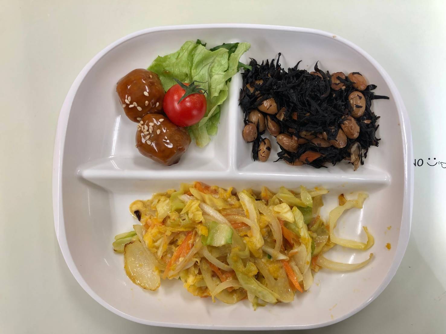 ・キャベツのたまご炒め ・ミートボール ・ひじき煮 ・ご飯 ・味噌汁