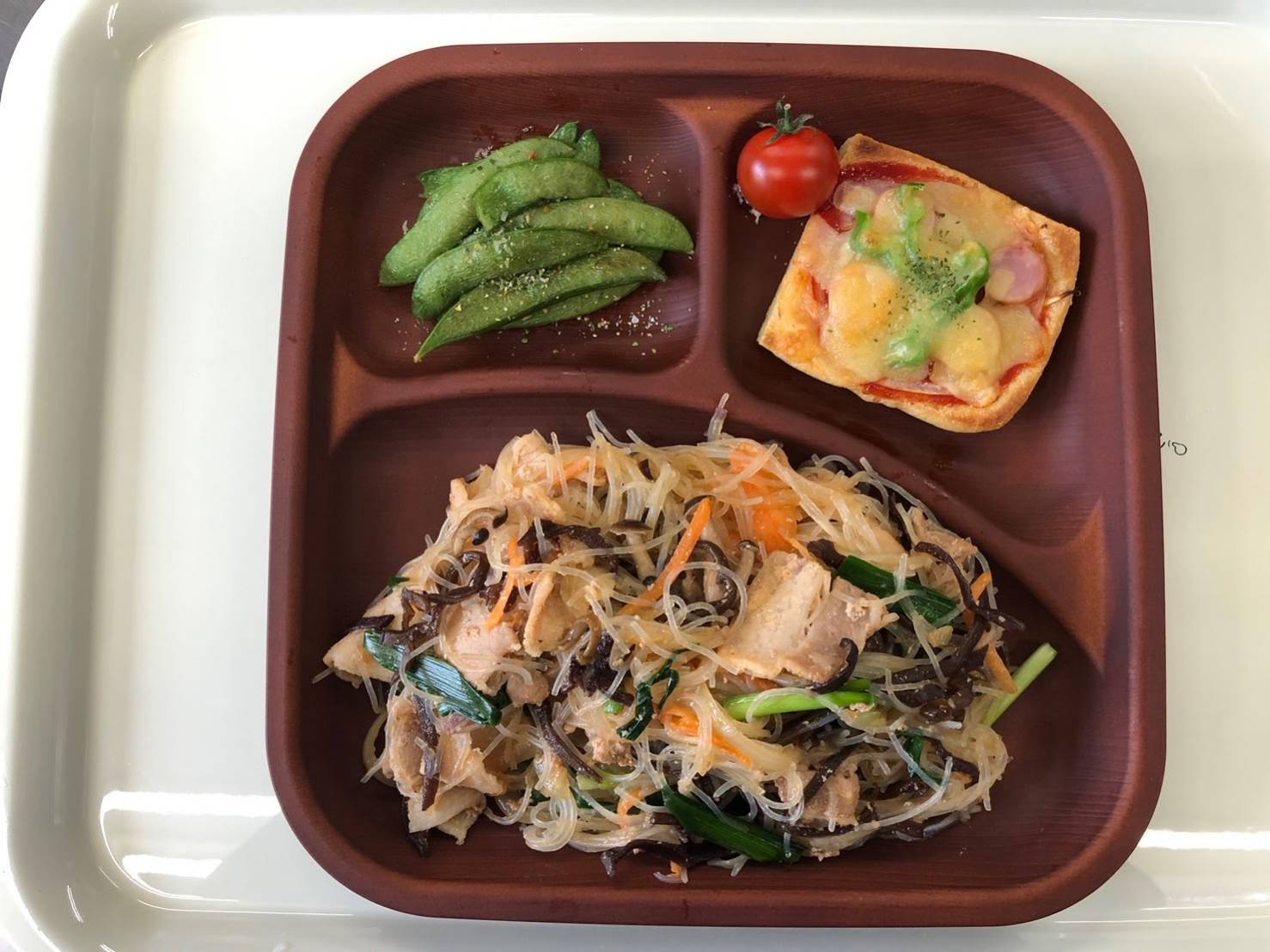 ・チャプチェ ・スナップえんどうスパイス炒め ・うすあげピザ ・ご飯 ・味噌汁