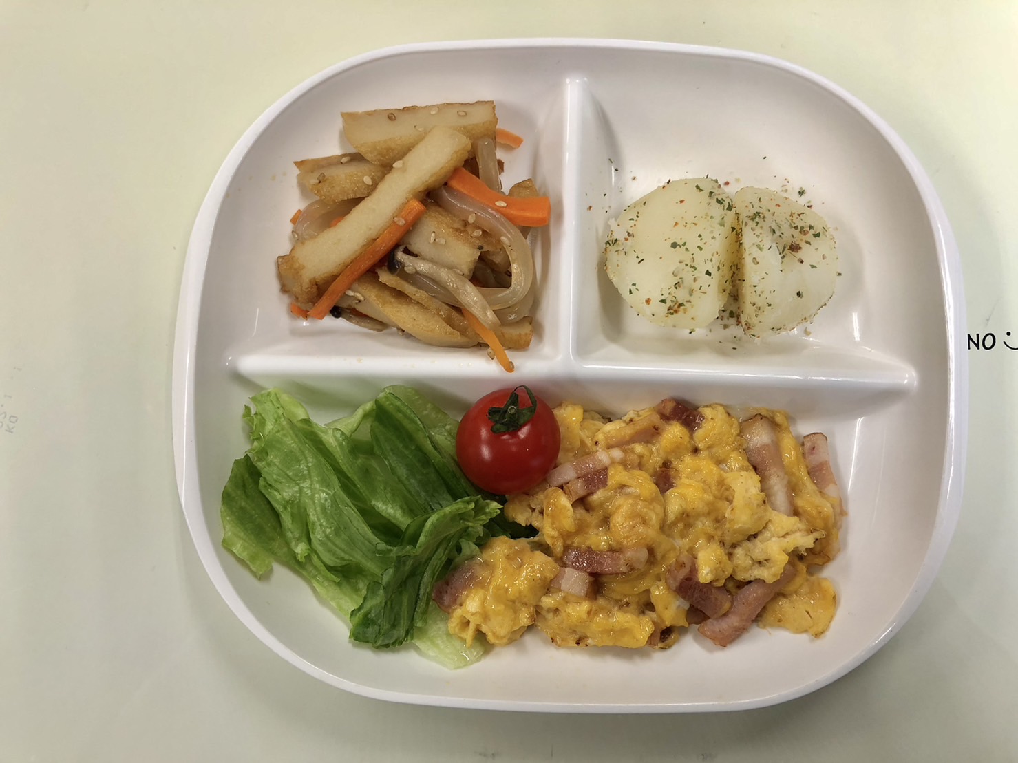 ・ベーコンスクランブルエッグ ・こふきいも ・厚あげ甘辛焼き ・ご飯 ・味噌汁
