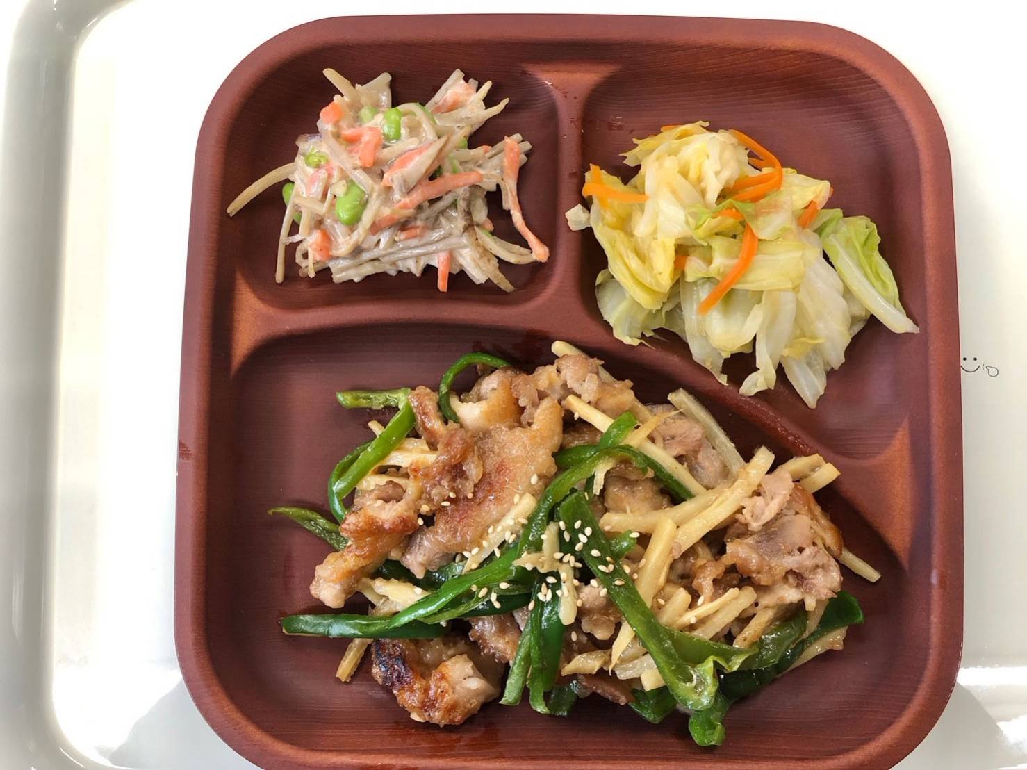・チンジャオロース風炒めもの ・ごぼうサラダ ・キャベツのおひたし ・ご飯 ・味噌汁