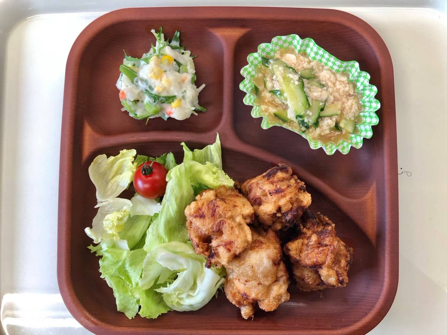 ・からあげ ・ポテトサラダ ・きゅうり&ツナのくずし豆腐 ・ご飯 ・味噌汁