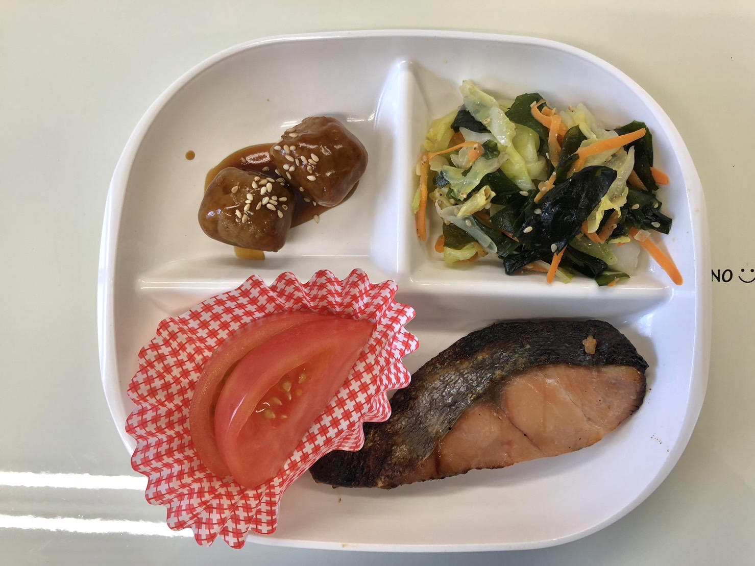 ・焼き魚 ・ミートボール ・キャベツとわかめのナムル ・ご飯 ・味噌汁