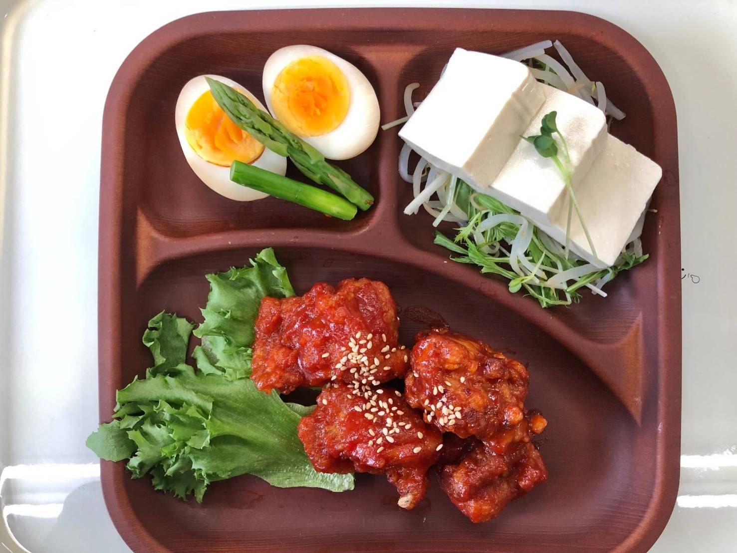 ・ヤンニョムチキン ・豆腐サラダ ・煮たまご ・ご飯 ・味噌汁