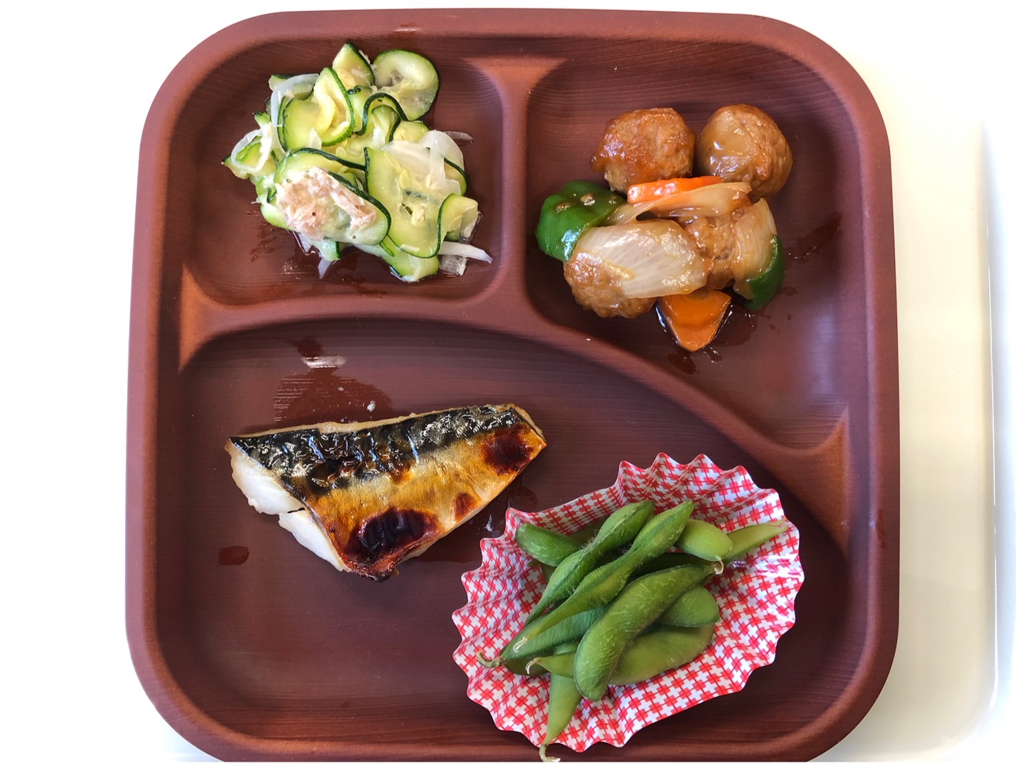 ・焼き魚 ・ズッキーニのサラダ ・肉団子炒め ・ご飯 ・味噌汁