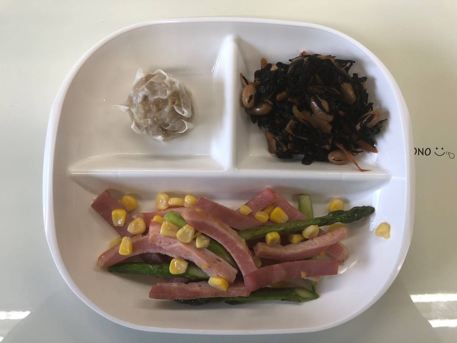 ・アスパラベーコン炒め ・しゅうまい ・ひじき煮 ・ご飯 ・味噌汁