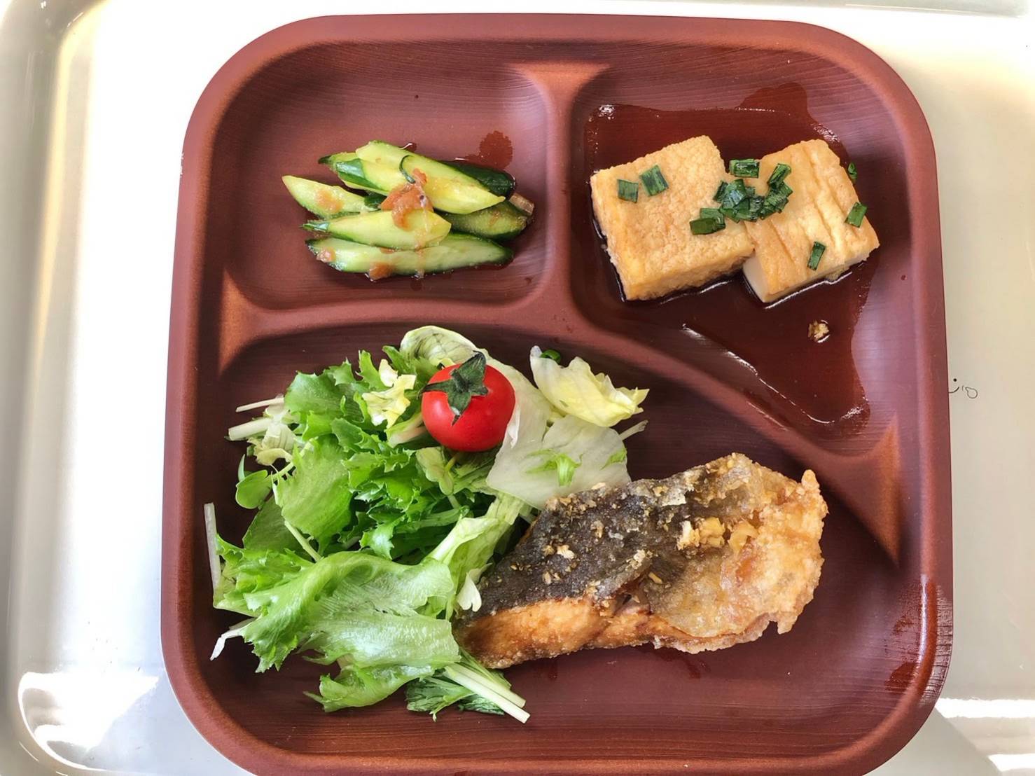 ・ピンクサーモンのから揚げ ・きゅうりの梅和え ・厚揚げねぎソース ・ご飯 ・味噌汁