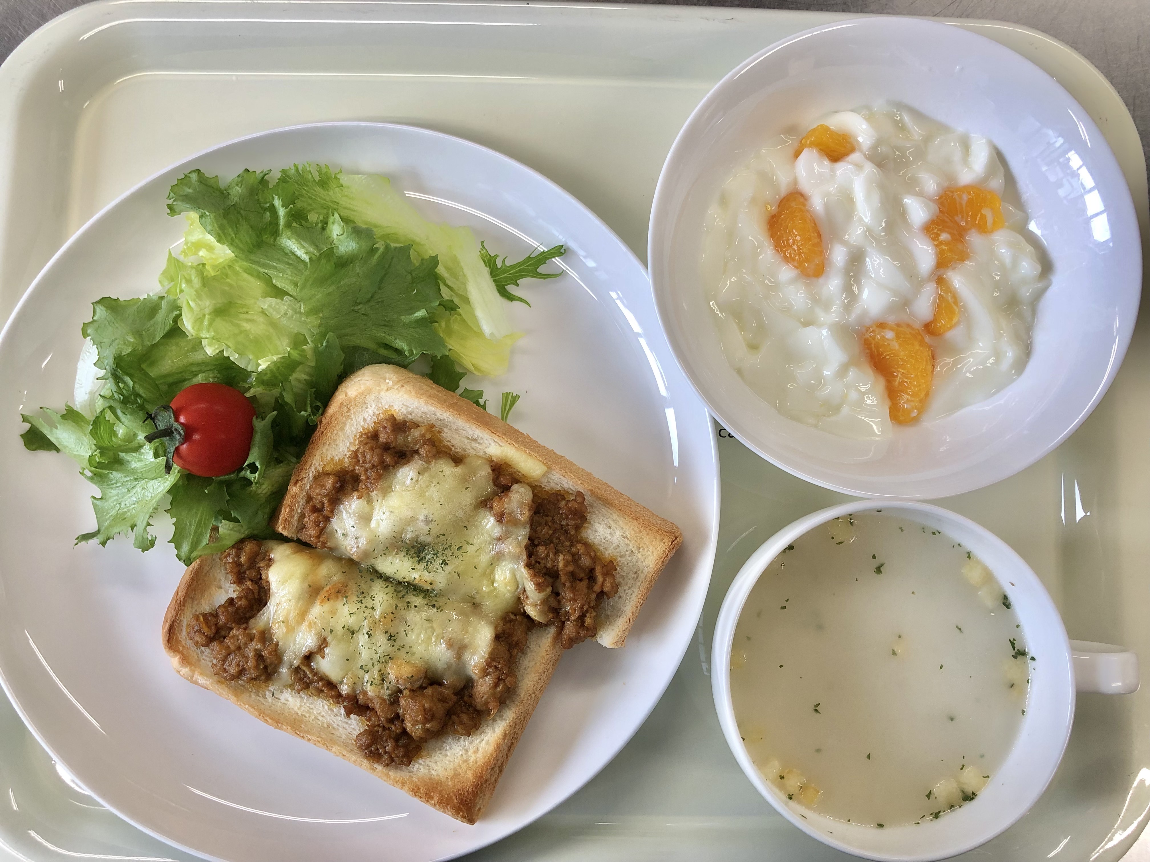 ・カレーチーズトースト ・サラダ ・スープ ・フルーツヨーグル
