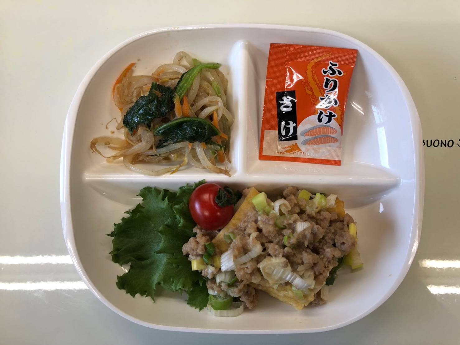 ・厚揚げのみそ炒め ・三色ナムル ・ふりかけ ・ご飯 ・味噌汁