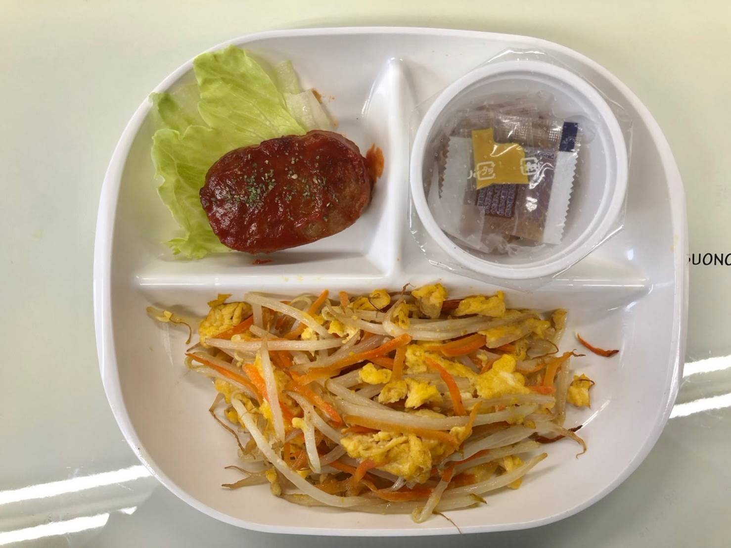 ・もやしのたまご炒め ・ミニハンバーグ ・納豆 ・ご飯 ・味噌汁