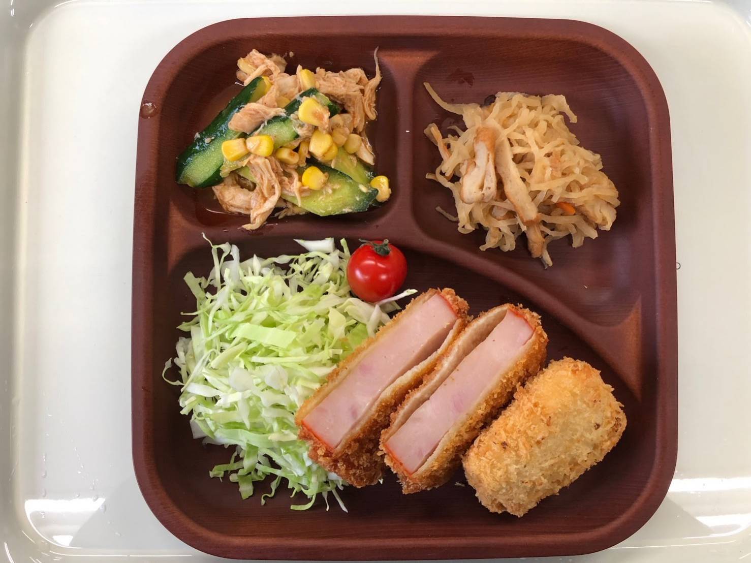 ・ハムカツ ・えびカツ ・きゅうりとササミのサラダ ・切り干し大根 ・ご飯 ・味噌汁