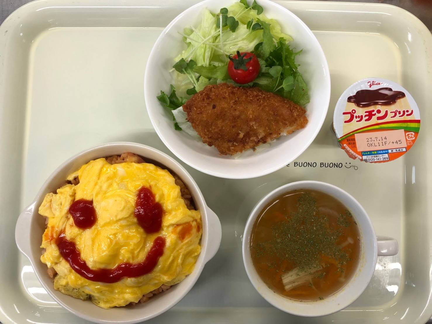 ・オムライス ・サラダ ・スープ ・プリン