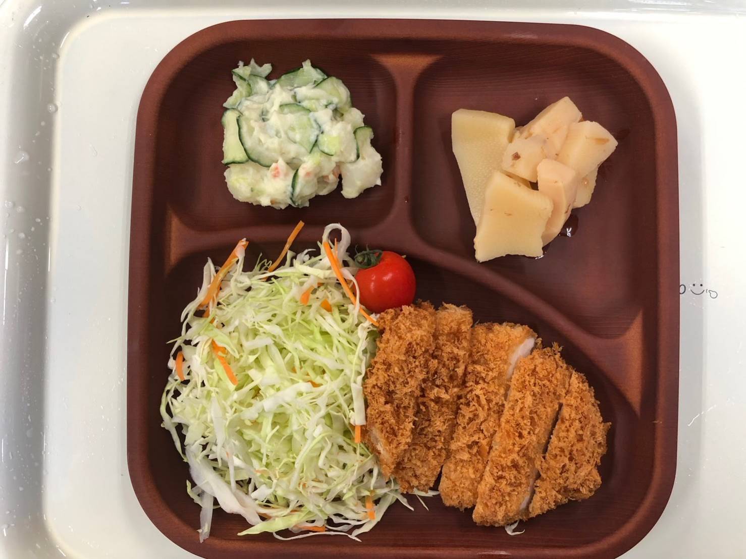 ・とんかつ ・ポテトサラダ ・竹の子の土佐煮 ・ご飯 ・味噌汁