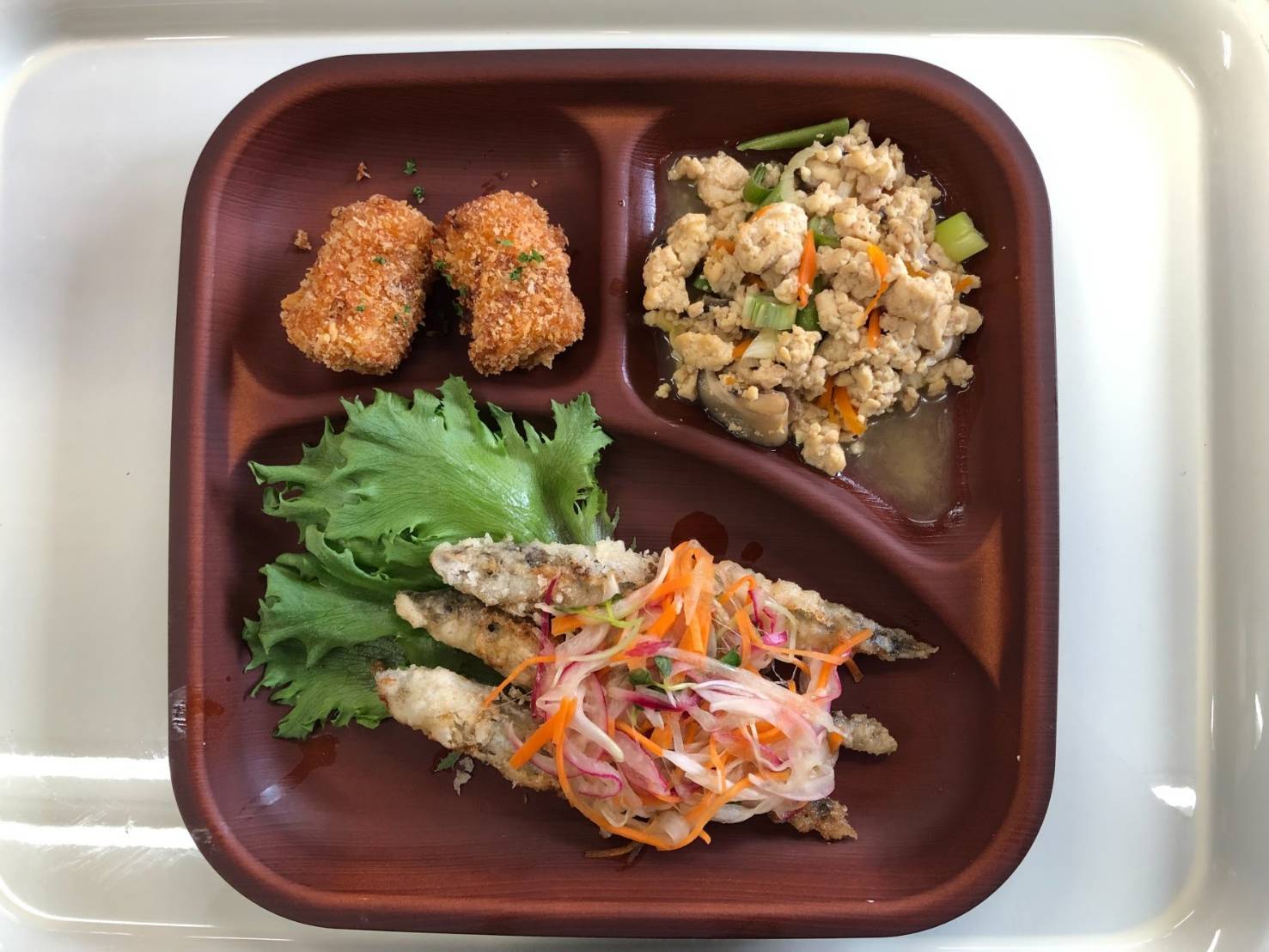 ・ししゃもの南蛮漬け ・炒り豆腐 ・ちくわのフライ ・ご飯 ・味噌汁