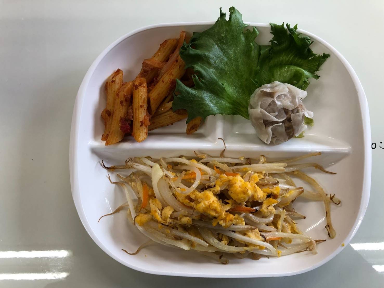 ・もやしのたまご炒め ・ケチャップペンネ ・しゅうまい ・ご飯 ・味噌汁