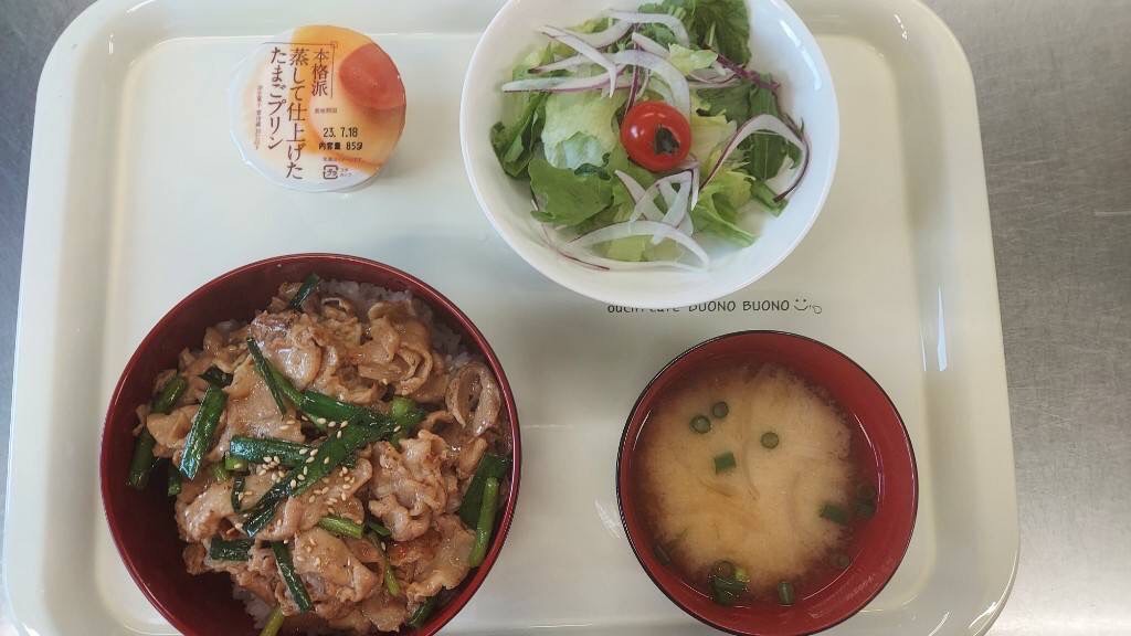 ・スタミナ焼肉丼 ・サラダ ・プリン ・味噌汁