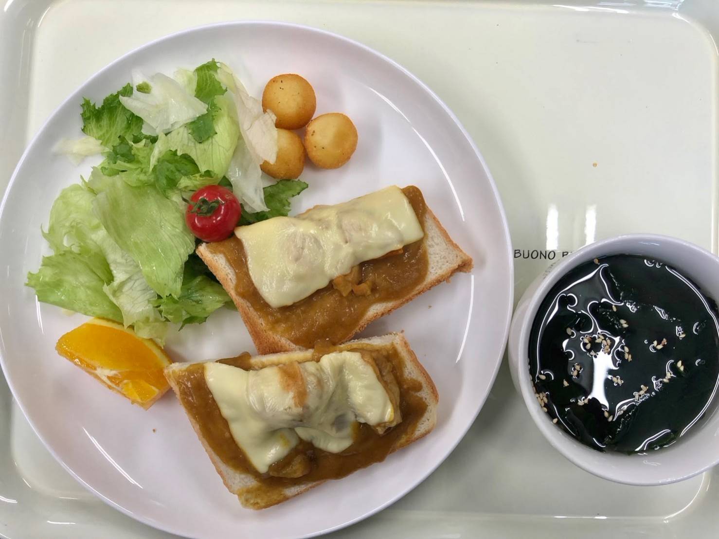 ・カレーチーズトースト ・グリーンサラダ ・丸ポテト ・オレンジ ・スープ