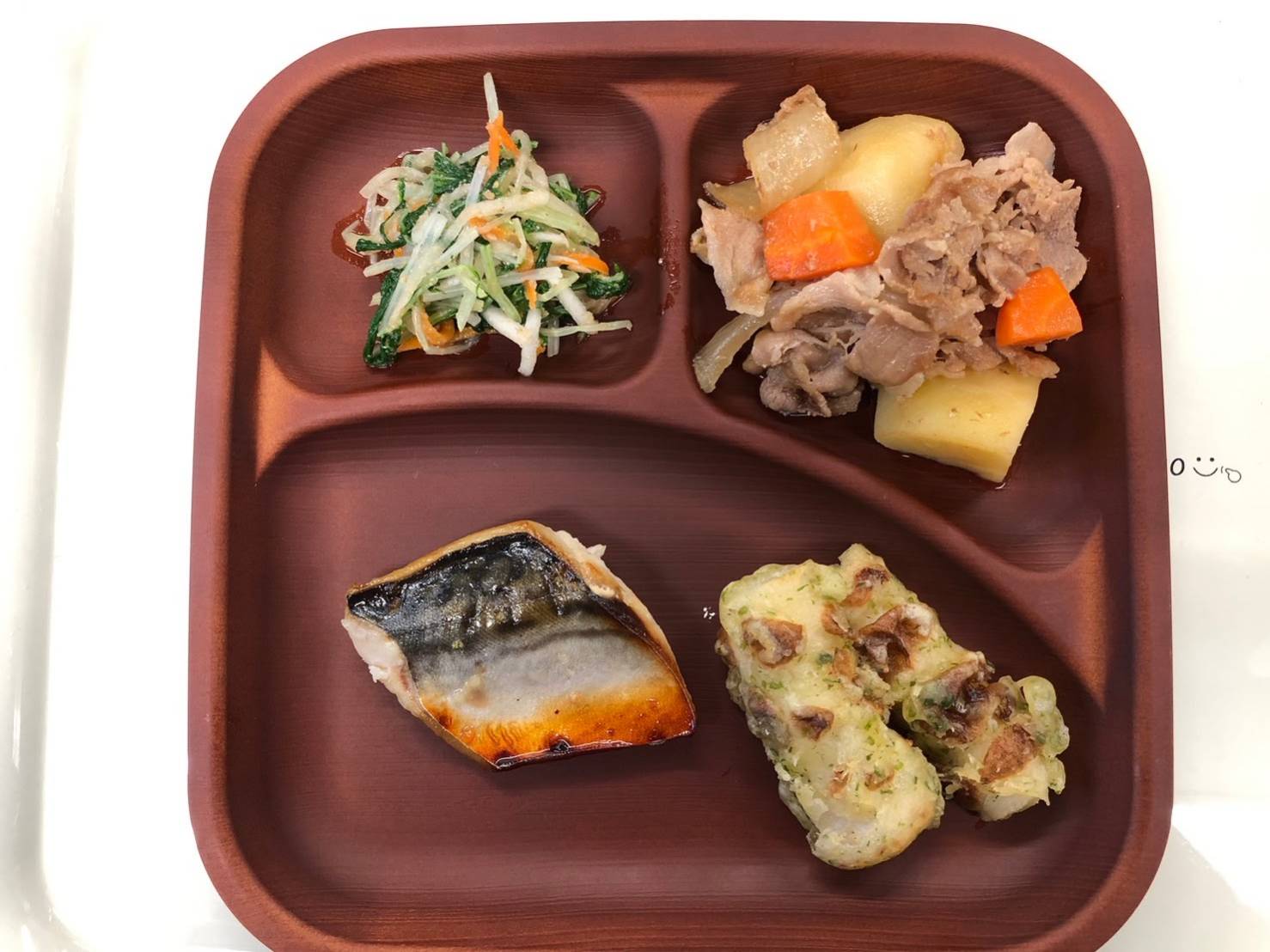 ・焼き魚 ・肉じゃが ・水菜ごま和え ・ちくわの磯辺揚げ ・ご飯 ・味噌汁