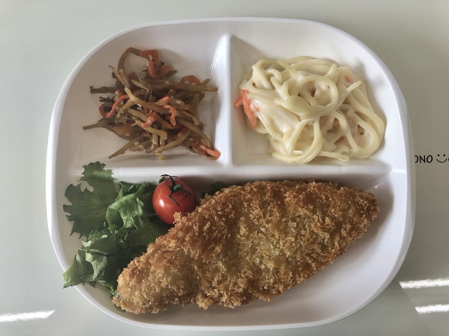 ・白身フライ ・きんぴらごぼう ・スパゲティサラダ ・ご飯 ・味噌汁