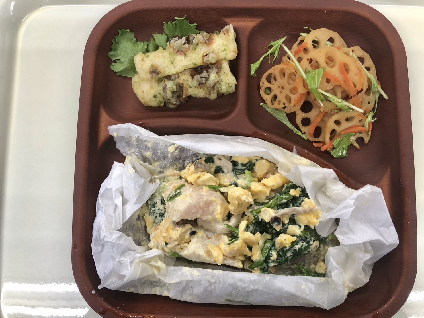 ・白身魚の包み焼き ・れんこんきんぴら ・ちくわの磯辺揚げ ・ご飯 ・味噌汁