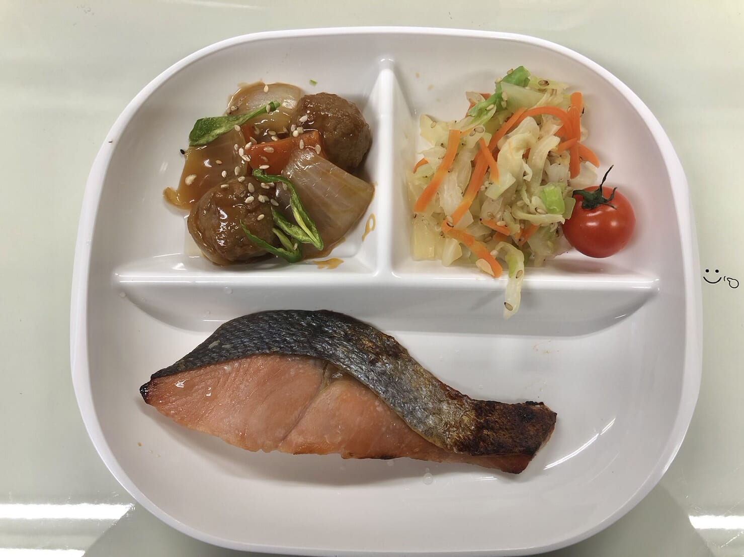 ・焼き魚 ・キャベツのごま和え ・ミートボール炒め ・ご飯 ・味噌汁