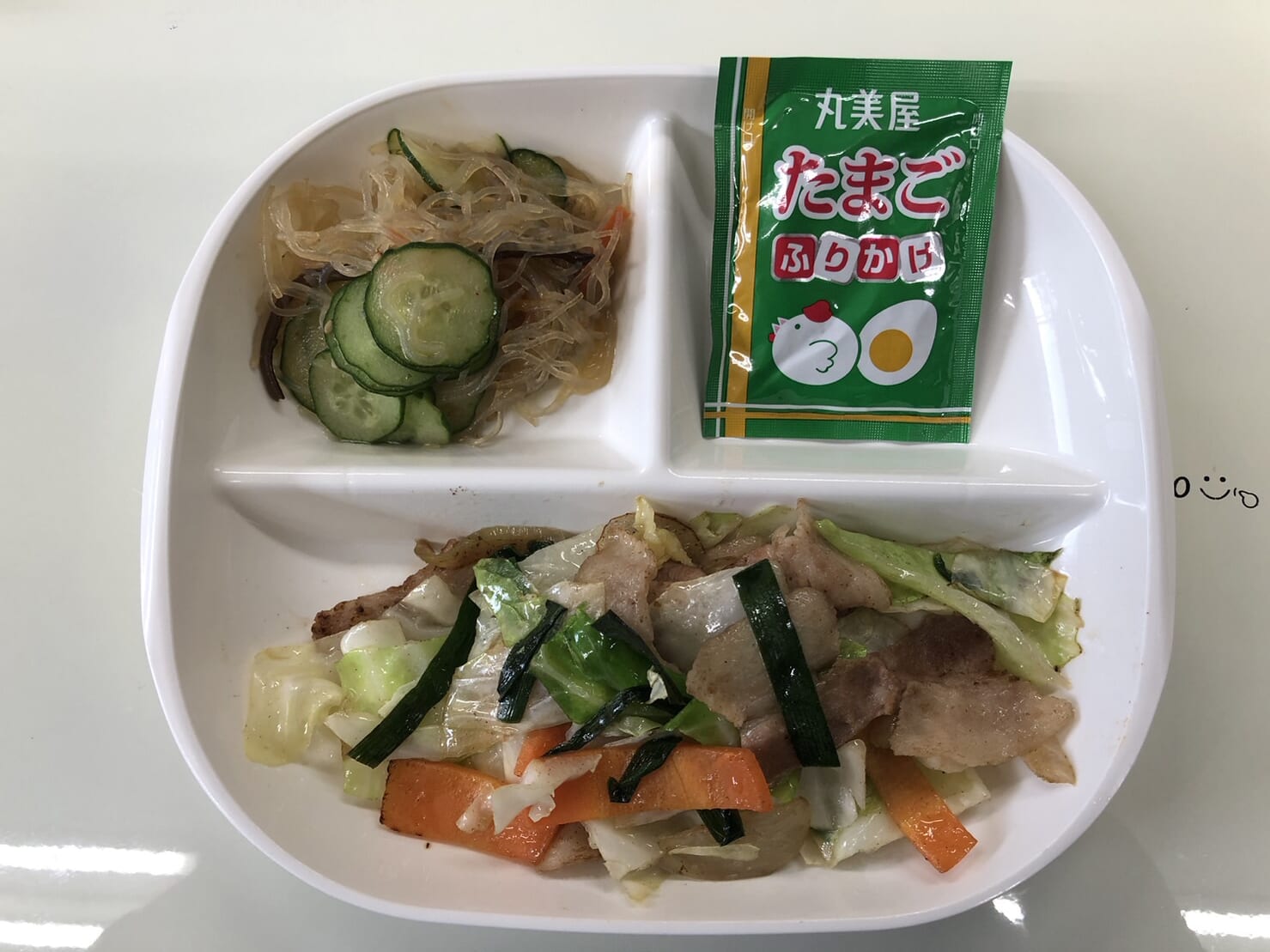 ・肉野菜炒め ・春雨サラダ ・ふりかけ ・ご飯 ・味噌汁
