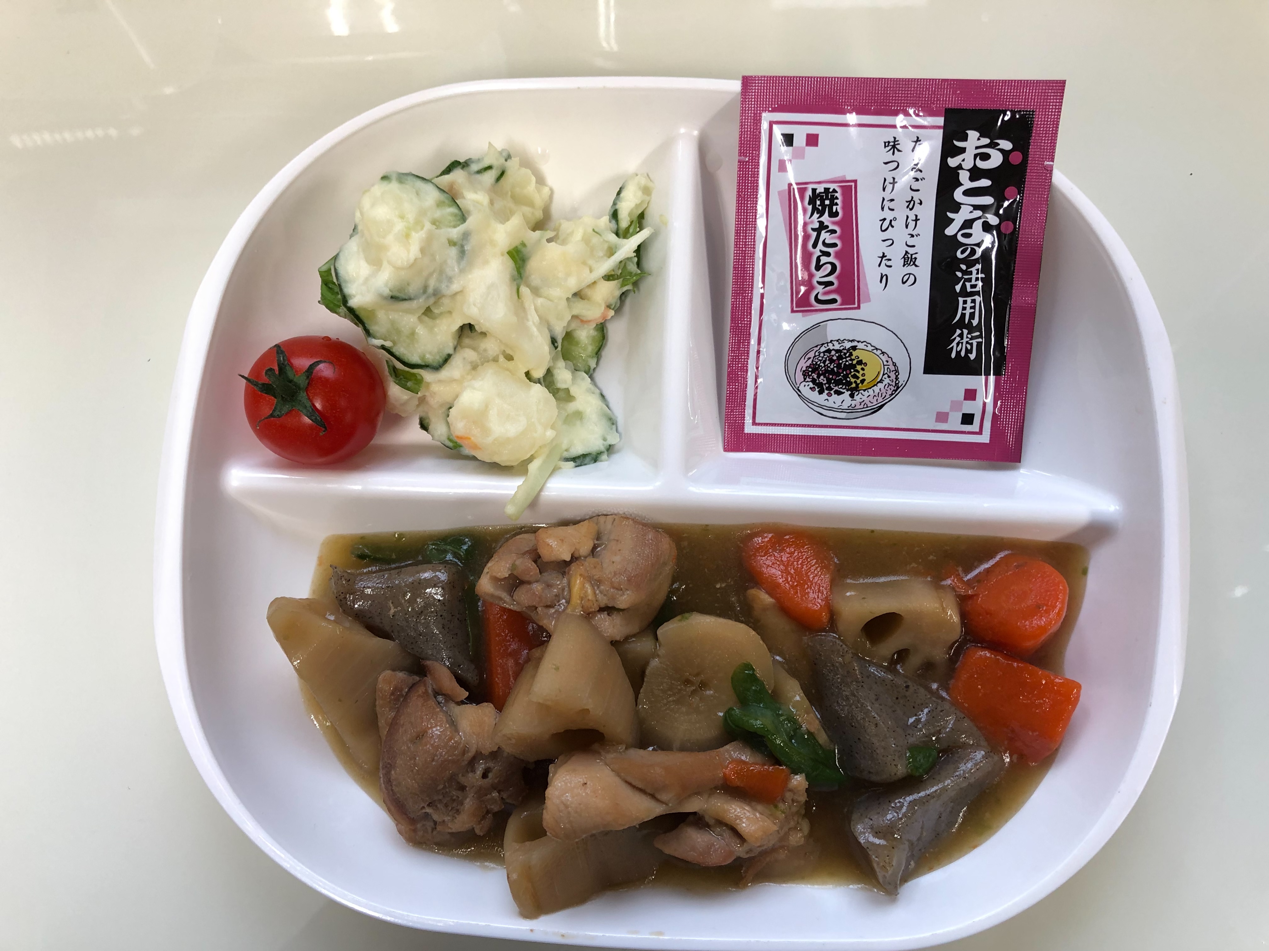 ・筑前煮 ・ポテトサラダ ・ふりかけ ・ご飯 ・味噌汁