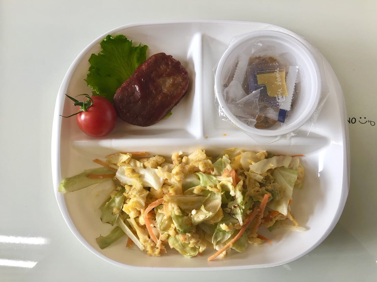 ・キャベツのたまご炒め ・ミニハンバーグ ・納豆 ・ご飯 ・味噌汁