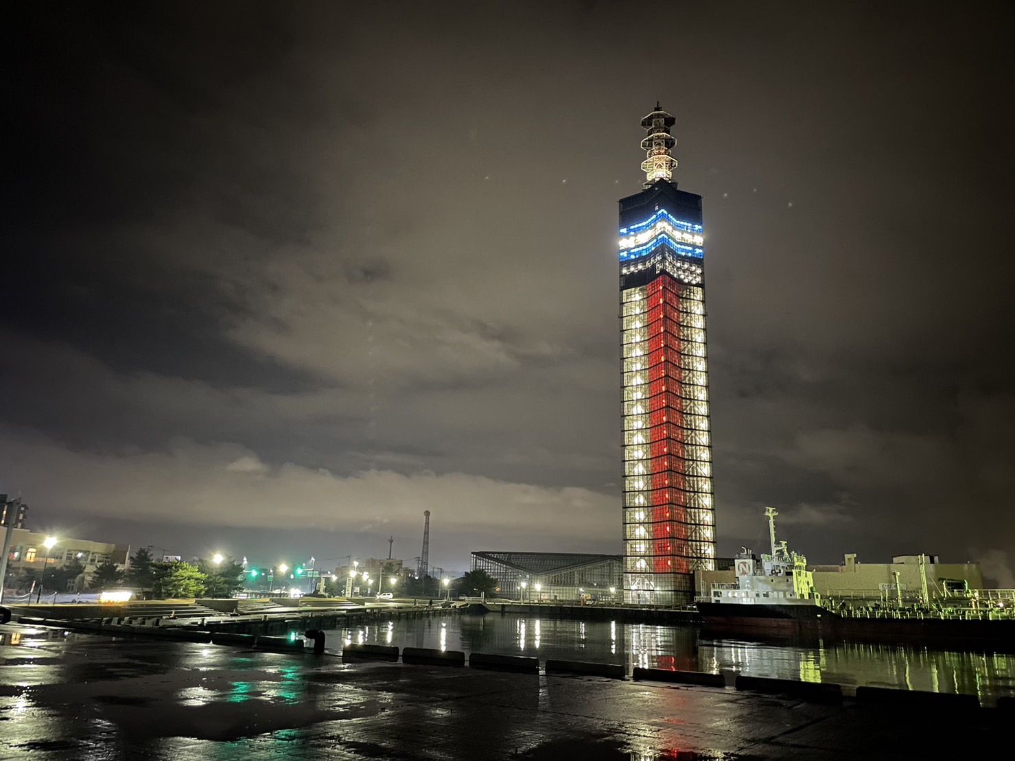 紅白にライトアップされたセリオンタワーを