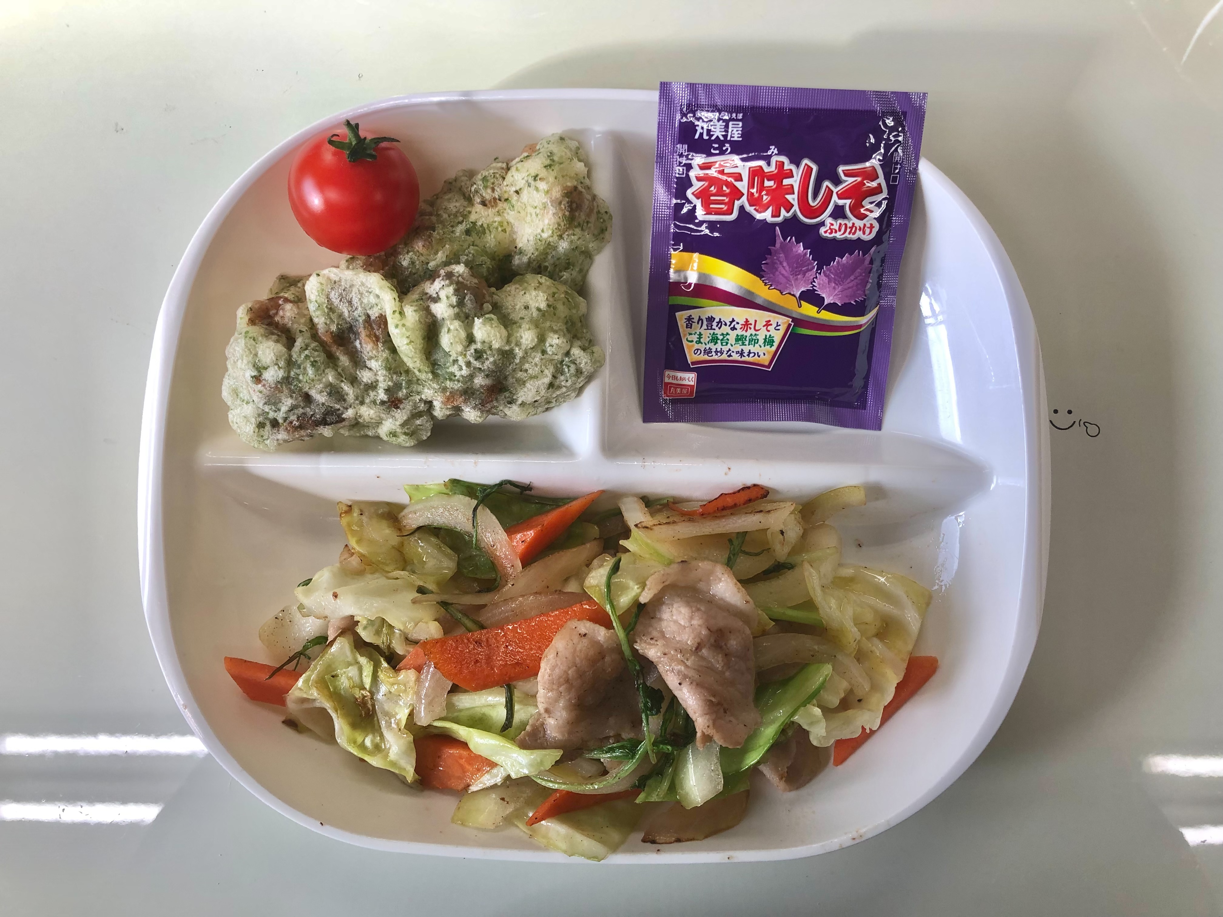 ・肉野菜炒め ・ちくわの磯辺揚げ ・ふりかけ ・ご飯 ・味噌汁