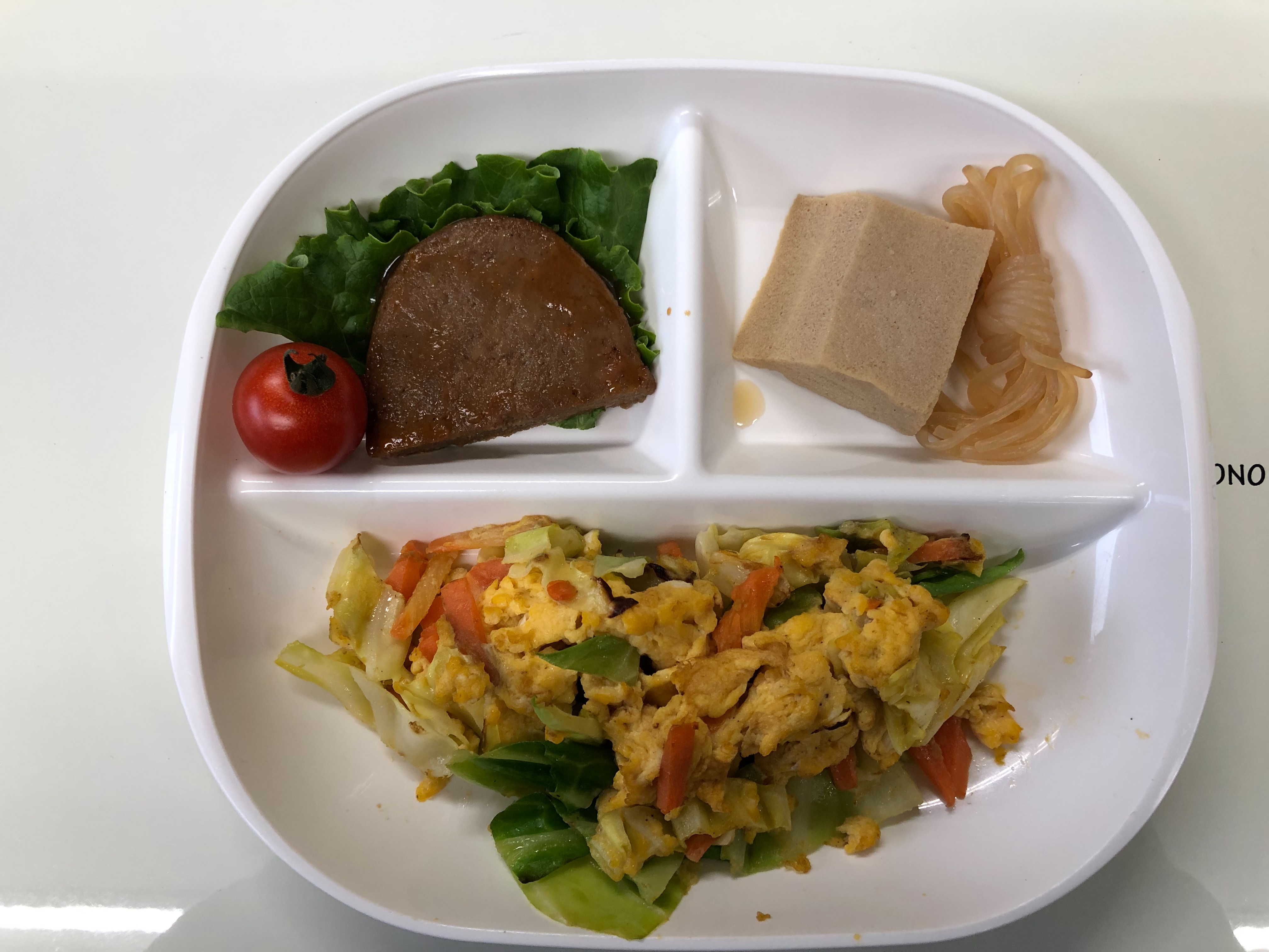 ・キャベツのたまご炒め ・ミニハンバーグ ・煮物 ・ご飯 ・味噌汁