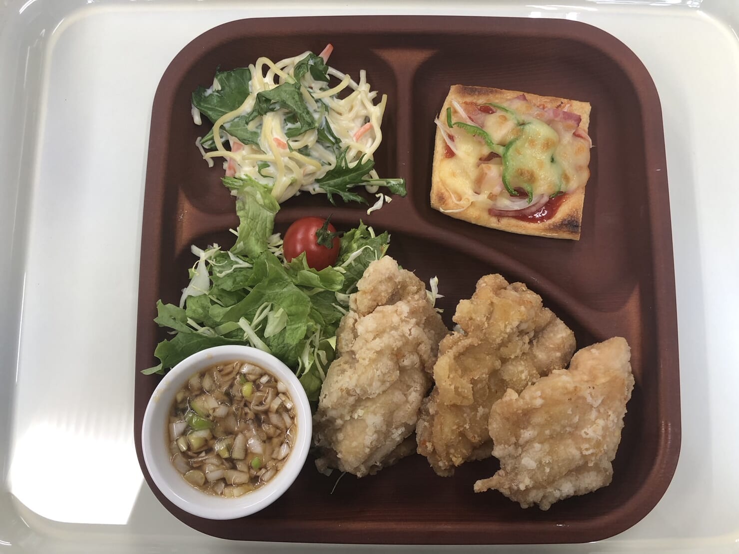 ・油淋鶏 ・スパゲティサラダ ・うすあげピザ ・ご飯 ・味噌汁