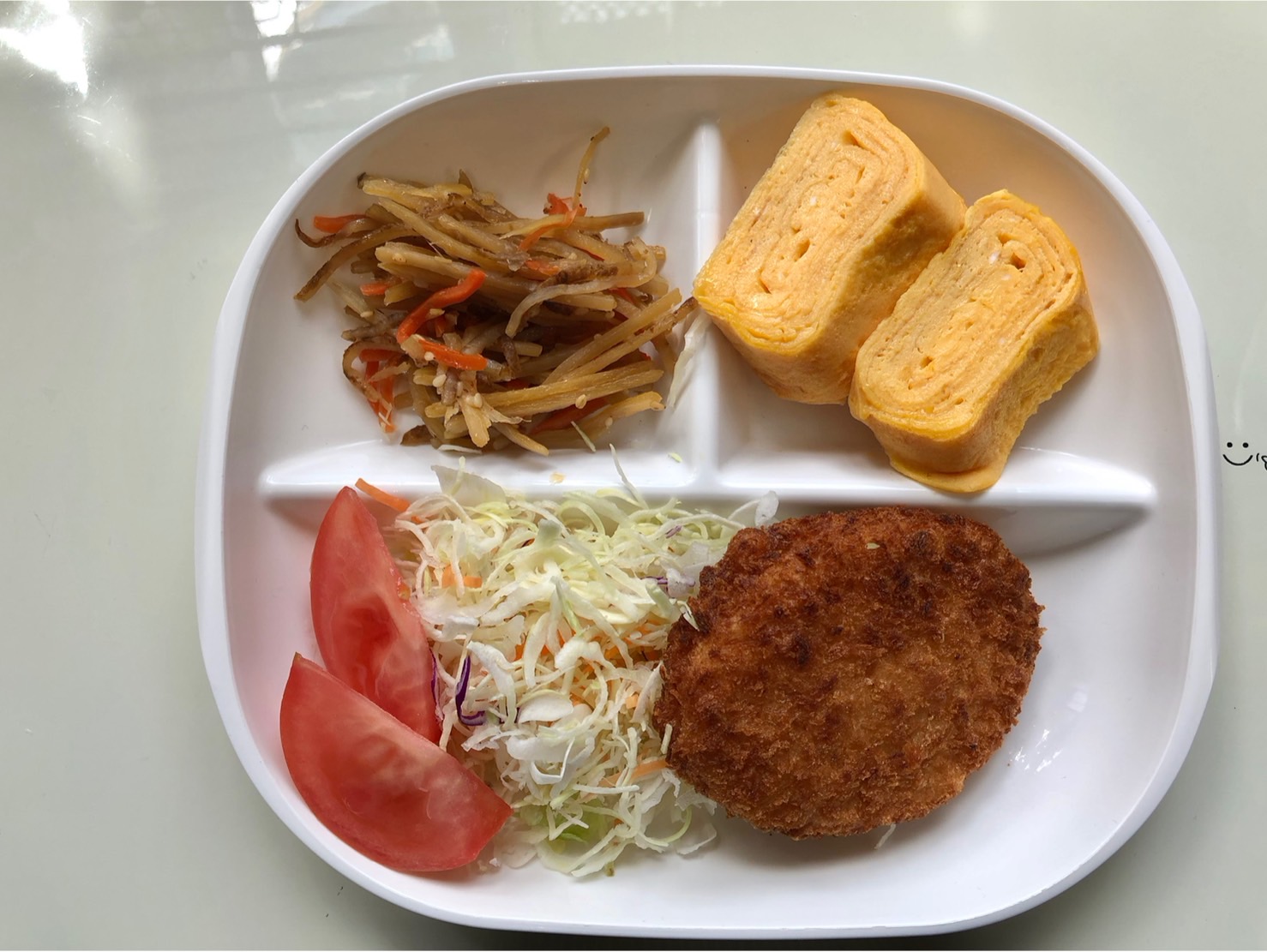 ・コロッケ ・玉子焼き ・きんぴらごぼう ・ご飯 ・味噌汁