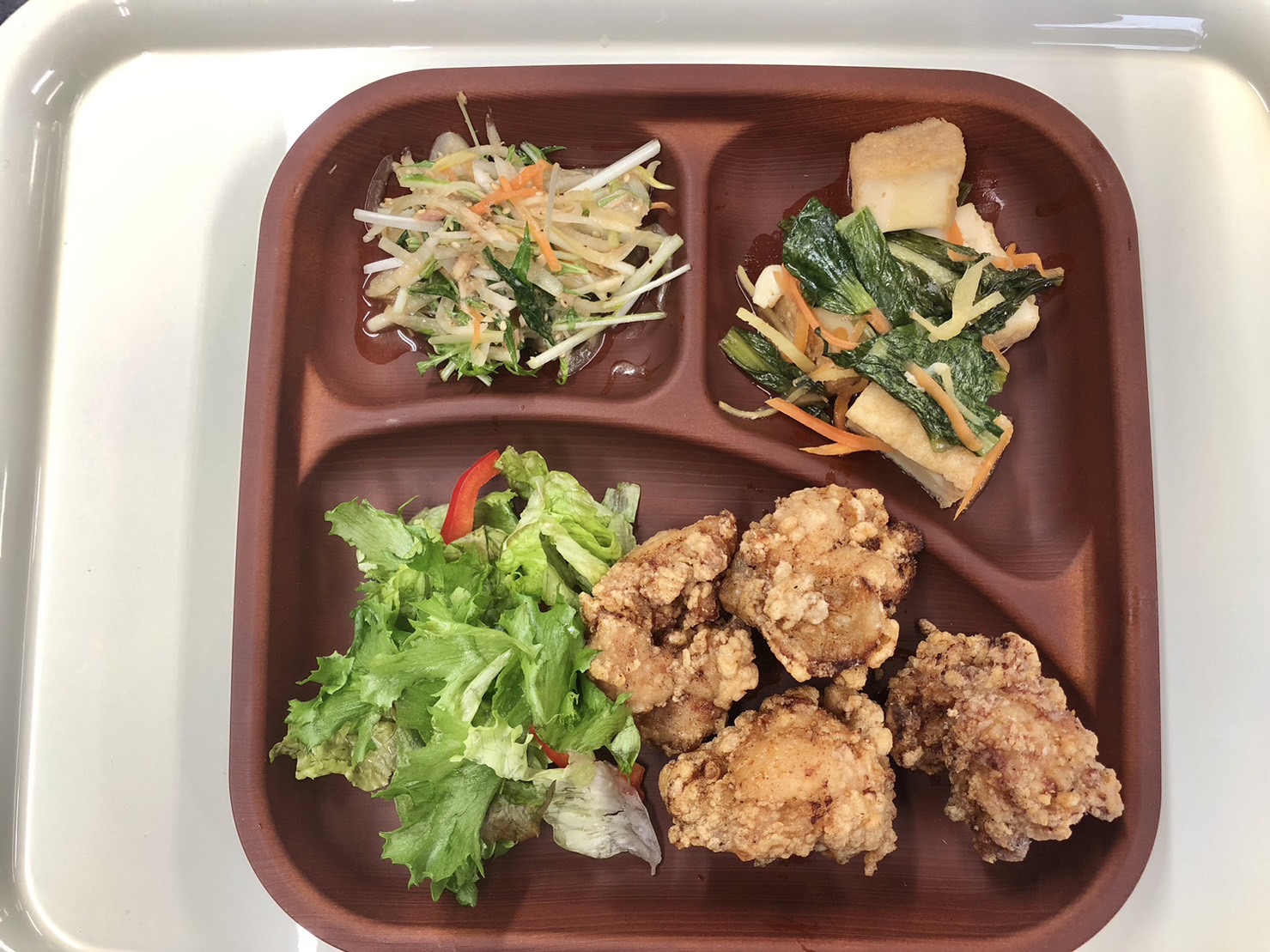 ・からあげ ・水菜のツナサラダ ・厚揚げと小松菜のしょうが炒め ・ご飯 ・味噌汁