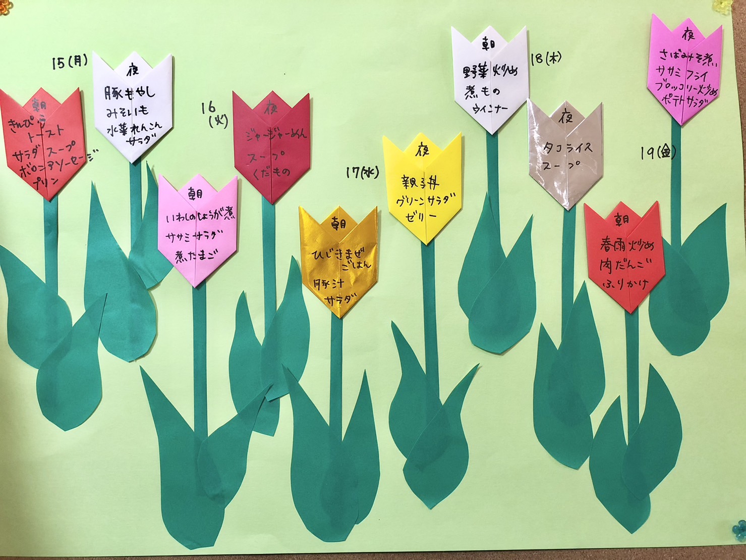 寮母さっちょんのメニュー表には カラフルなチューリップで華やかですね🥰