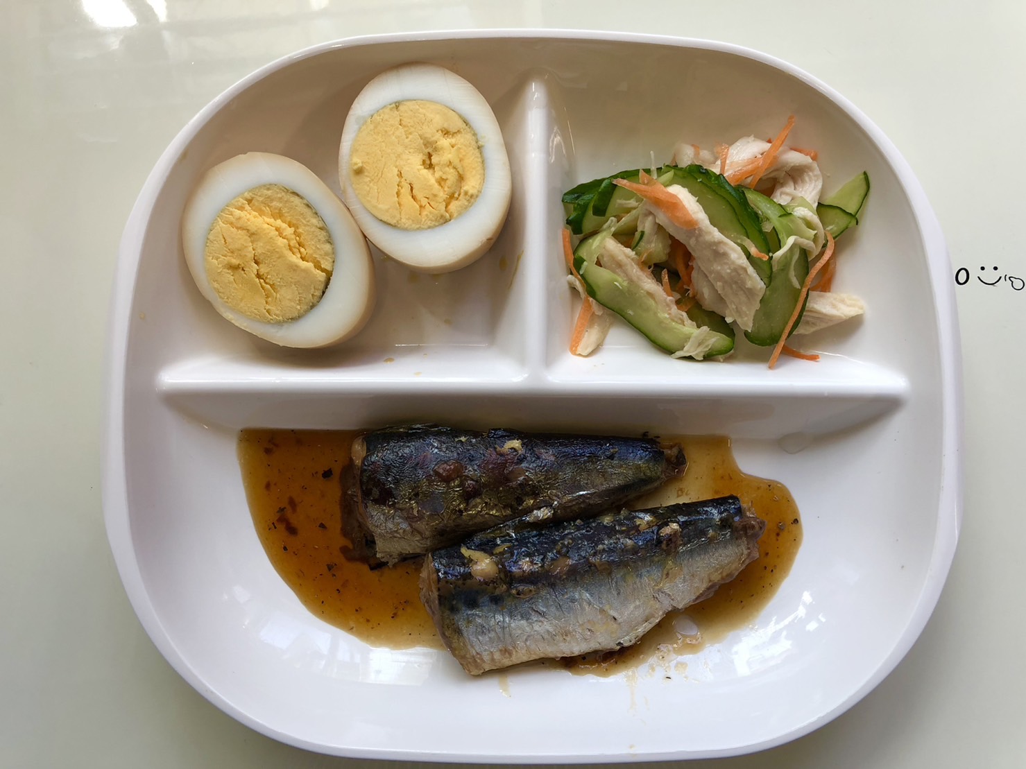 ・いわしのしょうが煮 ・煮たまご ・ササミサラダ ・ご飯 ・味噌汁