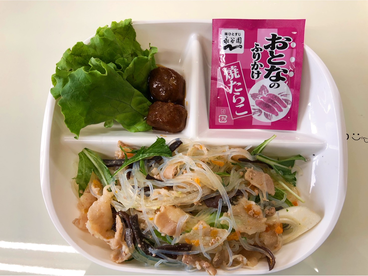 ・春雨炒め ・肉団子 ・ふりかけ ・ご飯 ・味噌汁