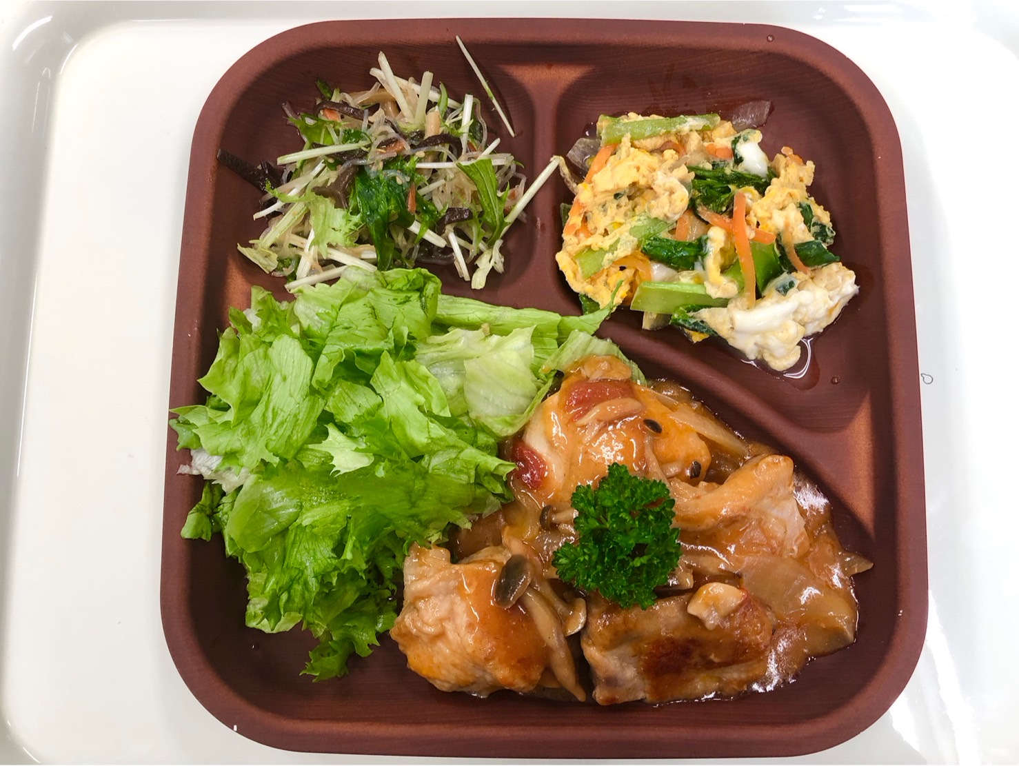 ・チキンのトマト煮 ・中華サラダ ・小松菜玉子とじ ・ご飯 ・味噌汁