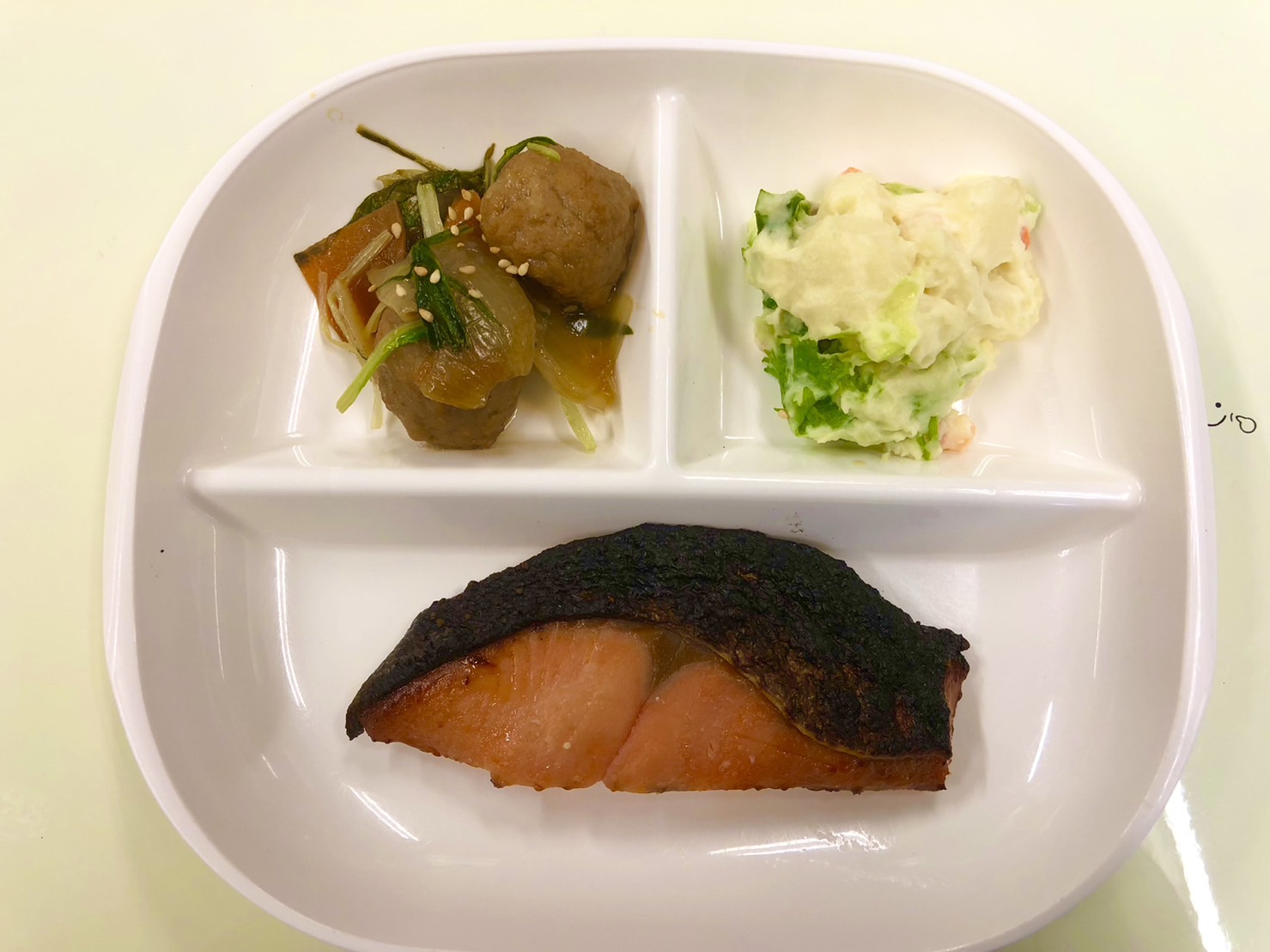・サケ西京焼き ・ミートボール炒め ・ポテトサラダ ・ご飯 ・味噌汁