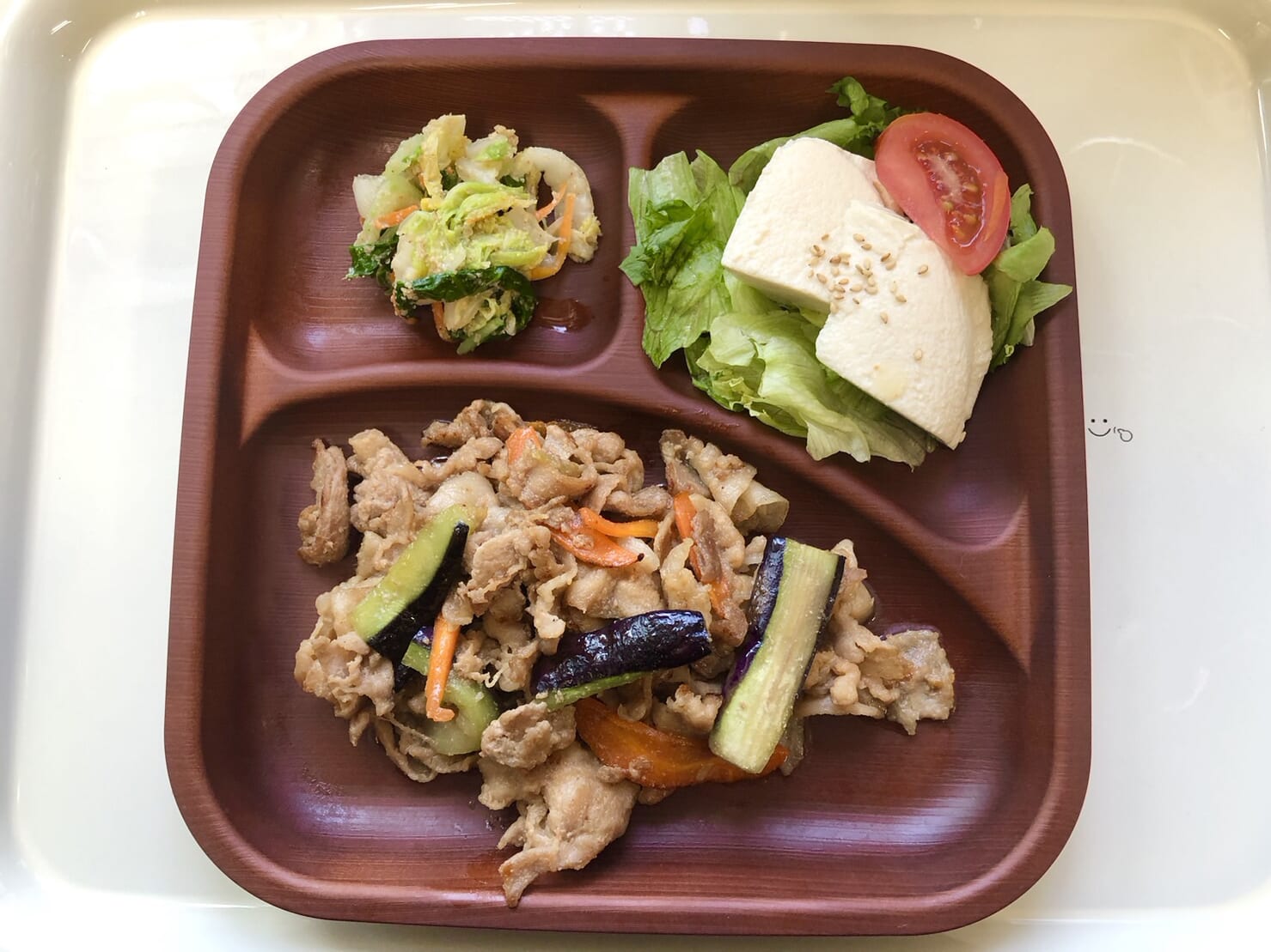 ・豚肉となすの味噌炒め ・白菜のごま和え ・豆腐サラダ ・ご飯 ・味噌汁
