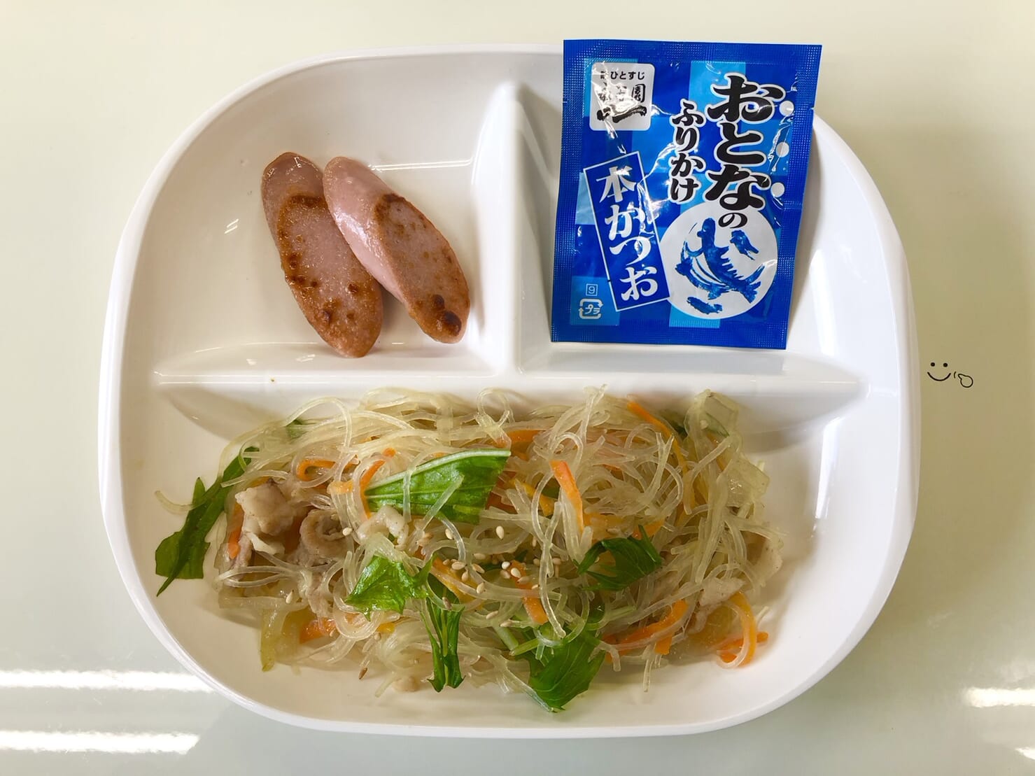 ・春雨炒め ・魚肉ソーセージ ・ふりかけ ・ご飯 ・味噌汁