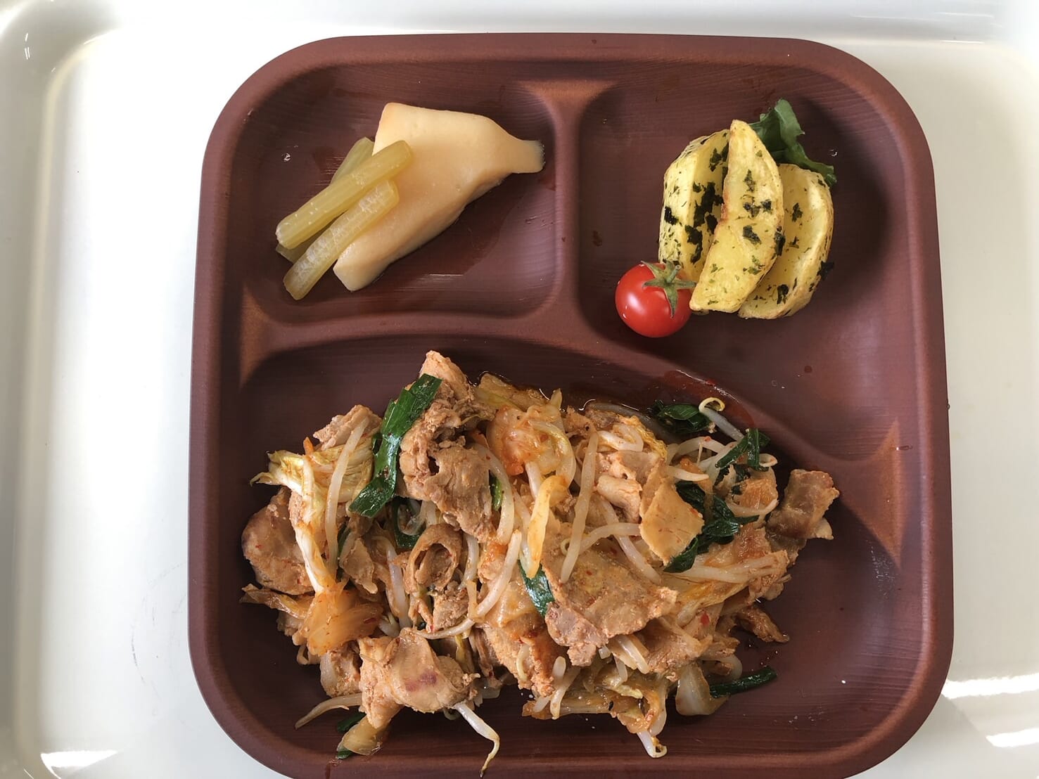 ・豚キムチ炒め ・のり塩ポテト ・煮物 ・ご飯 ・味噌汁