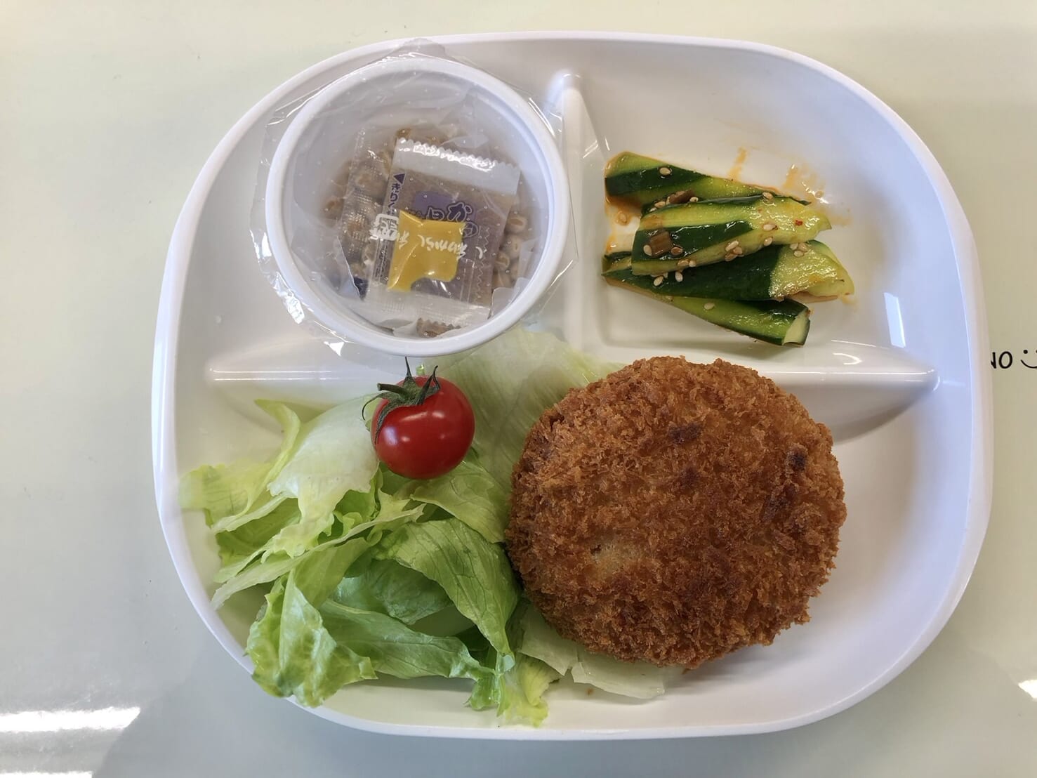 ・ハムカツ ・きゅうりのピリ辛和え ・納豆 ・ご飯 ・味噌汁