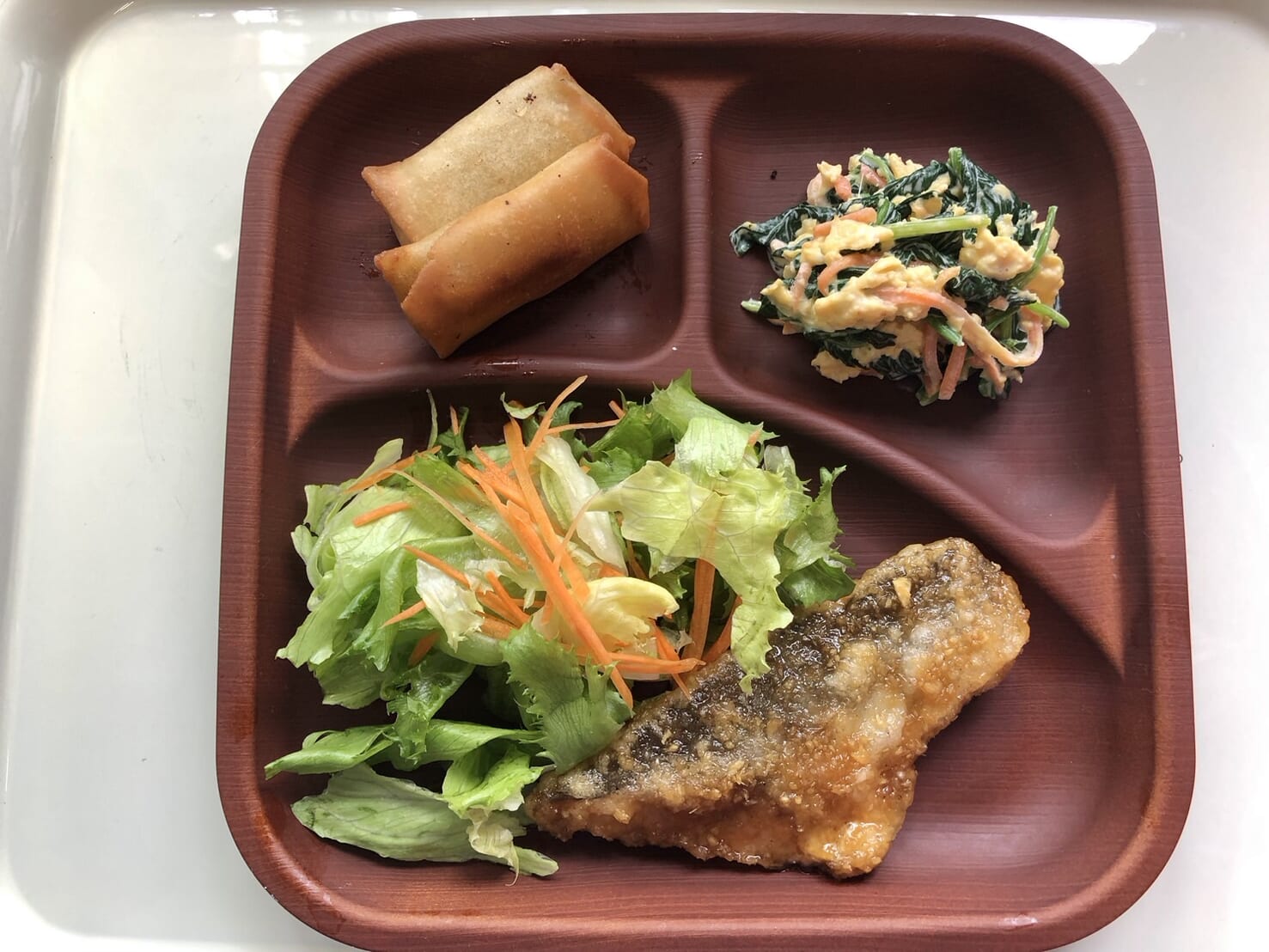 ・焼き魚 ・ほうれん草サラダ ・春巻き ・ご飯 ・味噌汁
