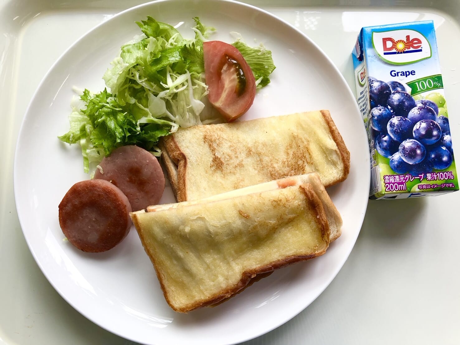 ・ホットサンド ・グリーンサラダ ・ボロニアソーセージ ・スープ ・ジュース
