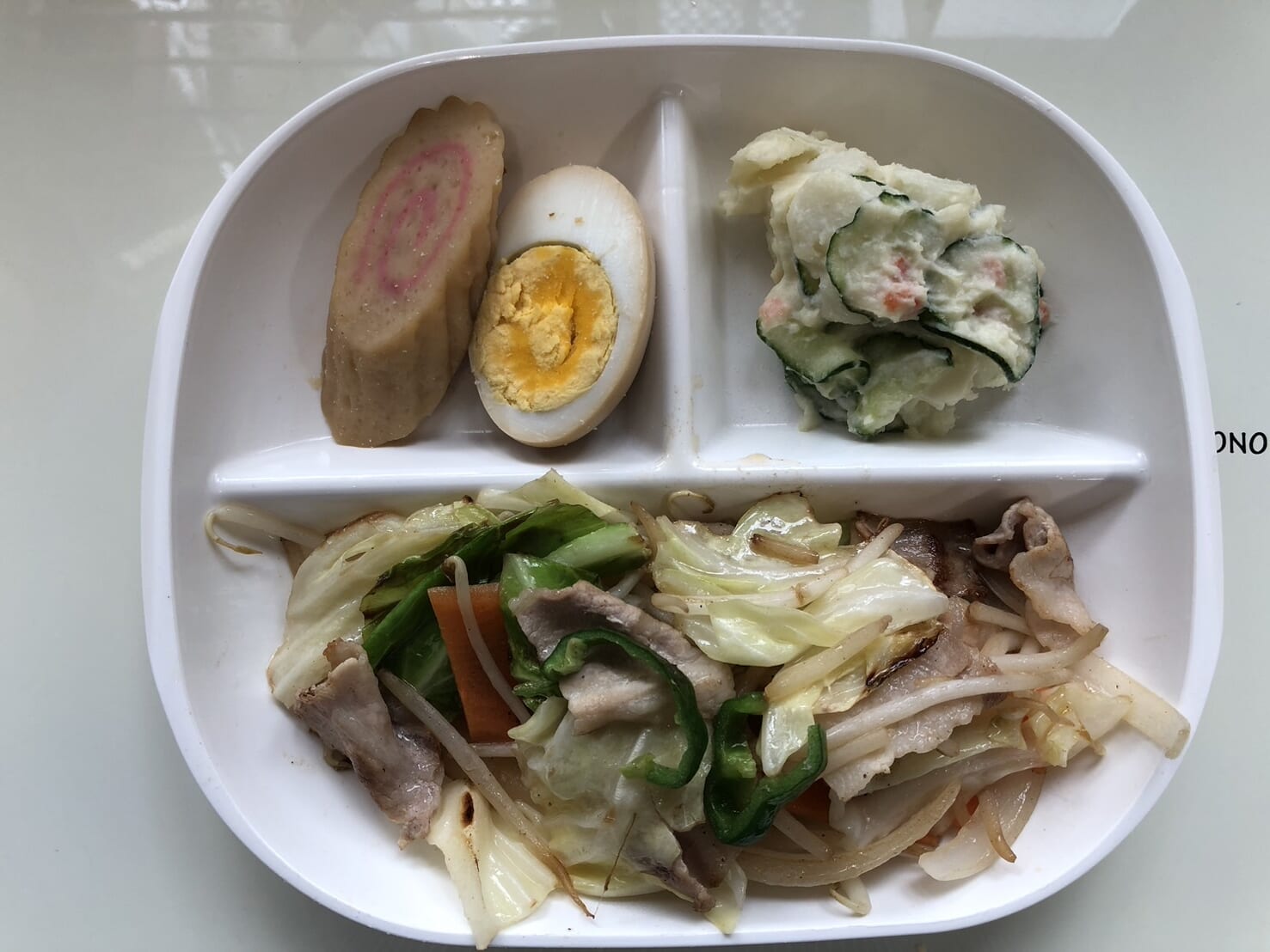 ・肉野菜炒め ・煮物 ・ポテトサラダ ・ご飯 ・味噌汁